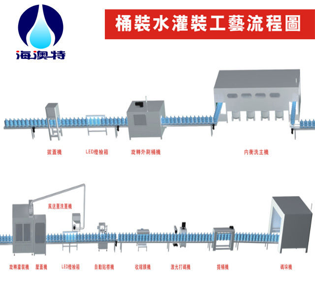 海澳特桶裝水設(shè)備風(fēng)力送蓋,桶裝水全線通暢,不卡蓋。30個(gè)*工位(10工位回水清洗,10工位*清洗,10工位無菌水清洗),*徹底無二次污染。桶裝水設(shè)備無蓋自動(dòng)報(bào)警。